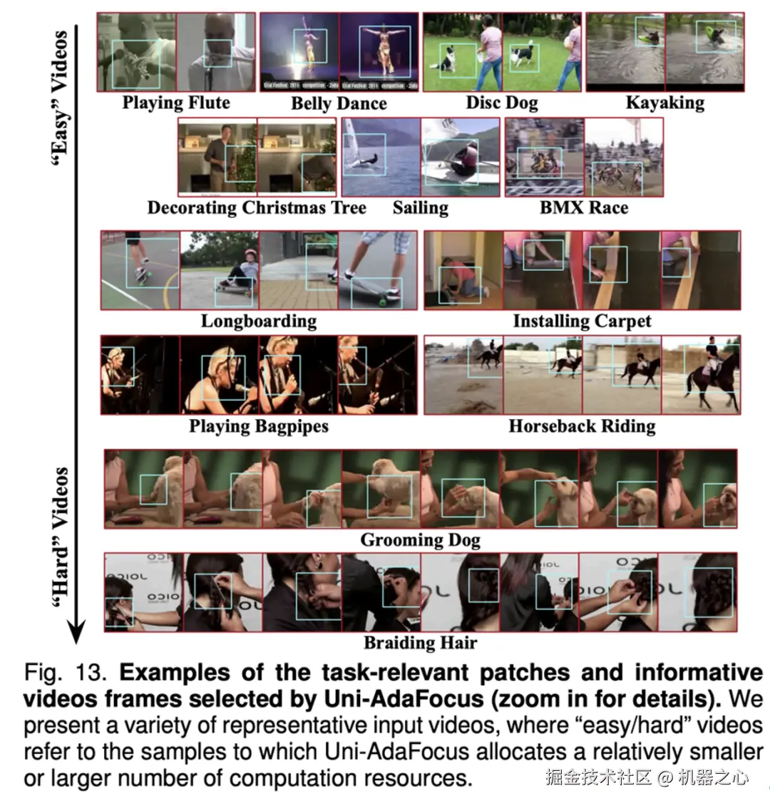 Uni-AdaFocus 的可视化结果。所示的视频帧为 Uni-AdaFocus 所选取的任务相关帧,浅蓝色方块表示 Uni-AdaFocus 在每一帧选择的 patch。可以看到 Uni-AdaFocus 成功定位到任务相关视频帧中的任务相关区域,例如长笛、小狗、圣诞树、马术运动员等,并能自适应地调整 patch 的大小和形状、以及任务相关视频帧的数目。