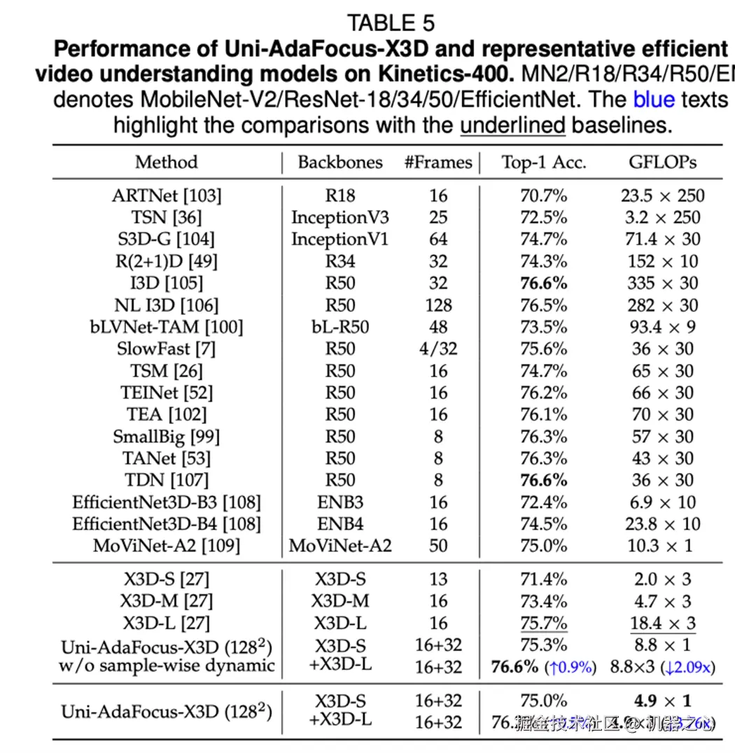 使用 X3D-S 和 X3D-L 为 backbone,Uni-AdaFocus 在 Kinetics-400 上的实验结果。