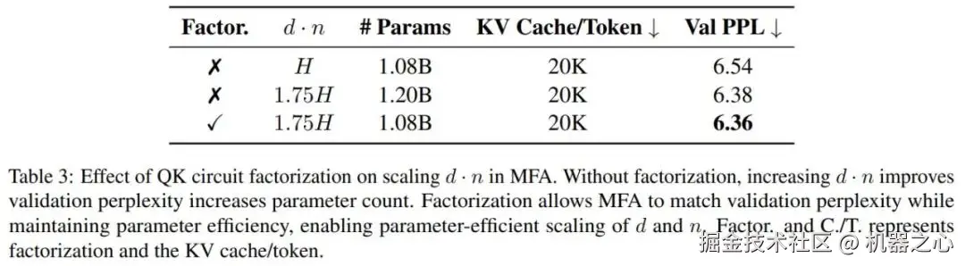 通过这个框架进行分析,可以发现与 MQA 相比,MFA 同时实现了更高的 SLSD 和更高的 TER;与 MLA 相比,在相似的参数预算下,MFA 不仅达到了更小的 KV cache 尺寸,还实现了更高的 TER,同时保持了相当的 SLSD;与传统的 MHA 相比,虽然 MFA 的 SLSD 较小,但它的 TER 更高,这解释了为什么在实验中 MFA 能够获得更好的性能。