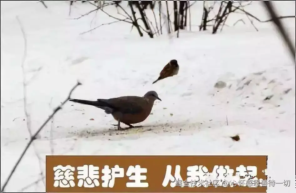 冬季护生:冬天鸟类食物匮乏,很多可以吃的果实、种子在深秋和初冬就被鸟儿啄食完毕。 尤其雪后,大雪覆盖了本来贫瘠的土地,鸟儿要一直饿着肚子等着雪化了才能觅食。 即便有喜鹊等鸟类有非常少的提前掩埋的食物,也会因为雪反光和种种情况,迷失方向,反复寻找都找不到掩埋的地方,