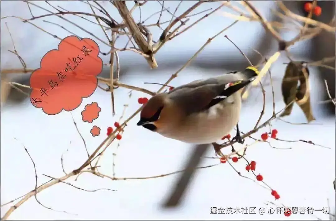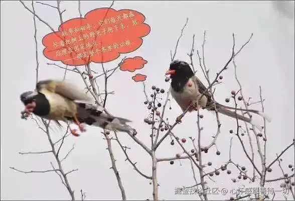红果是忍冬科植物,冬天下雪时结果。家里有庭院的,可以多种点忍冬科植物,为鸟儿冬季提供口粮。