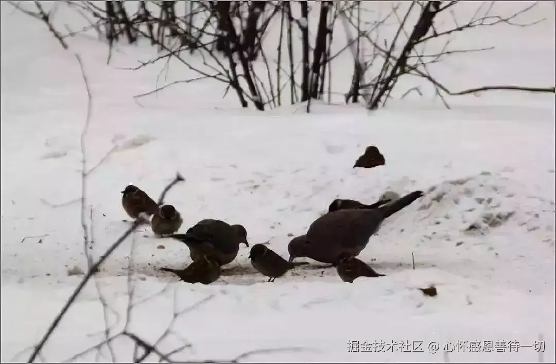 但是只有我的后院有许多小鸟脚印,象是在徘徊,脚印起始的地方正好是我平时向院外扔食物站立的前方,也就是放食物的地方。