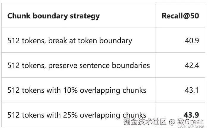 重叠可以帮助将相邻的块链接在一起,并为块提供更好的上下文信息。然而,即使是非常激进的25%重叠也只能将准确率提高1.5%,从42.4%提高到43.9%。这意味着这不是优化RAG性能的最有效方法。