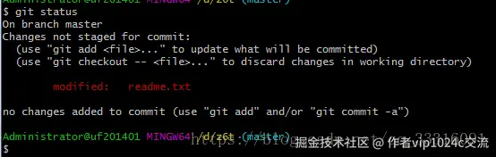 但是现在我不想使用上面这两种方法。接着撤销该怎么操作呢?首先在做撤销之前,使用git status查看当前的状态。如下所示:显示已经修改,但没有添加到暂存区。