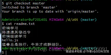 同样,现在切换到master分支上来,查看此时的内容为keep hungry的内容,如下: