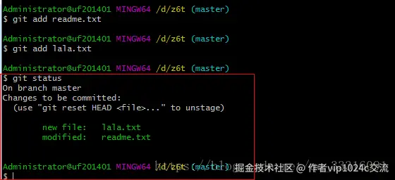 现在使用git add 命令把两个文件都添加到暂存区中,在使用git status来查看状态,如下: