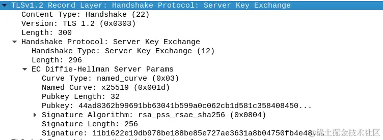 这是一条服务器发送给浏览器的消息。注意如果使用 RSA 生成 pre_master 的话,是没有这条消息的,因为不需要服务器再提供任何参数了。