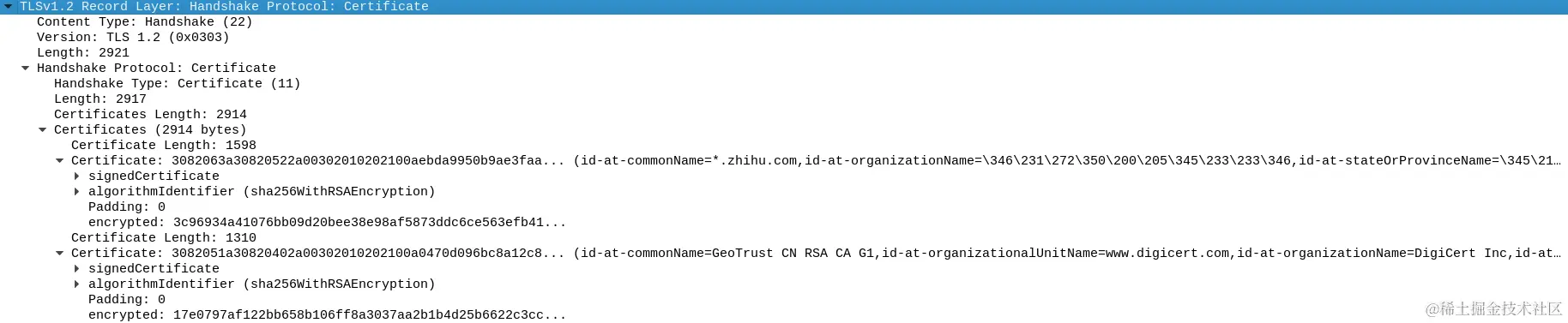 下图是知乎服务器返回的证书链,可以看到有两张,zhihu.com 的服务器证书和中间证书。注意,根证书通常不包含在其中。因为根证书就在计算机中,没有必要再去传输。