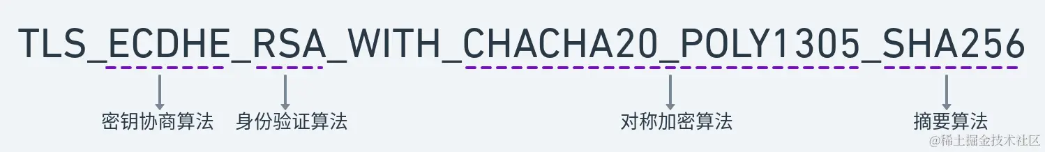 Cipher Suite 表示服务端选定的密码套件是 TLS_ECDHE_RSA_WITH_CHACHA20_POLY1305_SHA256 。简单画个图分析一下。
