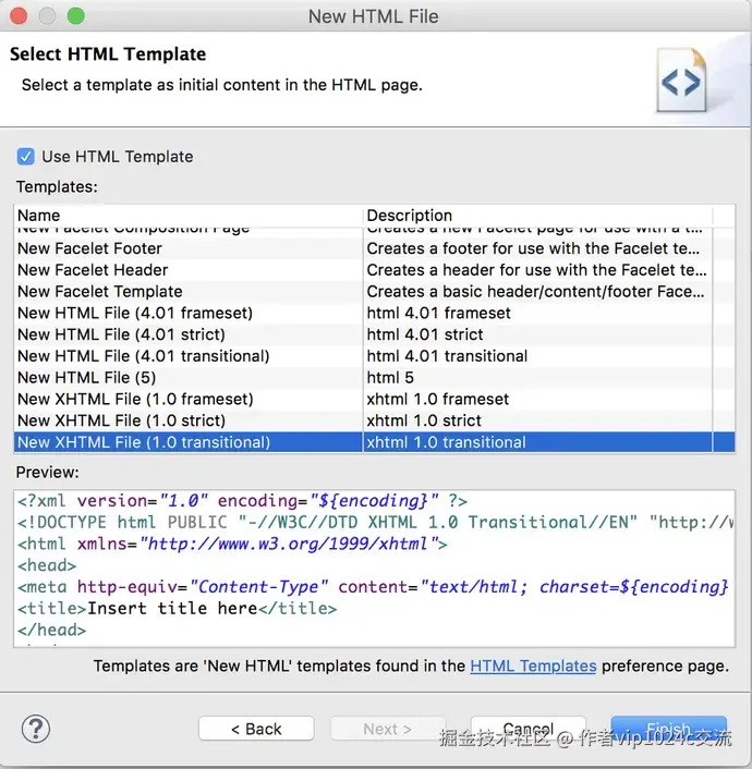 选择New XHTML (1.0 transitional) 模板,此为Java EE官方推荐,有着更严格的HTML语法,比如标签必须成对出现。最后点击完成。