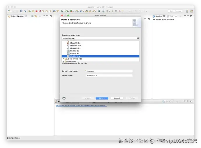 重启后,重复之前的添加server步骤,这次选择Wildfly 10.x。然后点击Next.