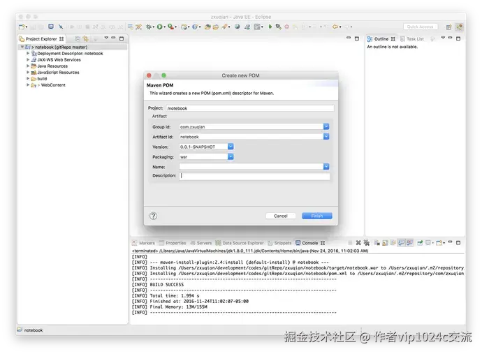 填写group id,一般为域名形式。Artifact id一般为项目名称。这两个名称组合可以在Maven仓库中唯一标识此项目。点击Finish。