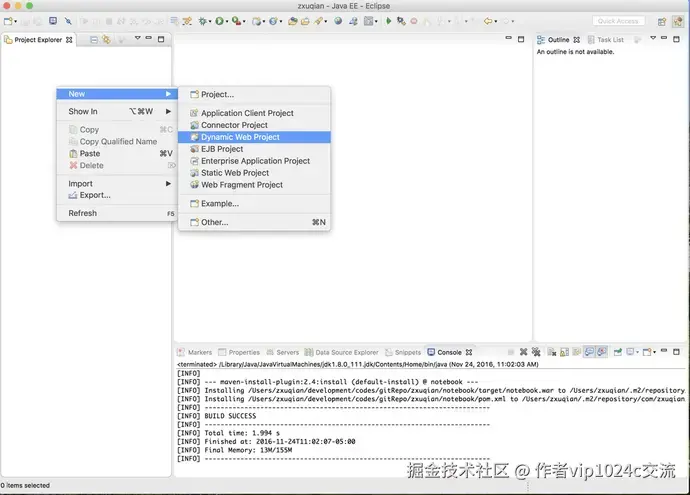 首先创建一个dynamic web project,稍后会转换为Maven项目。在Project Explorer, 右击,选择New, 然后在子菜单中选择Dynamic Web Project。