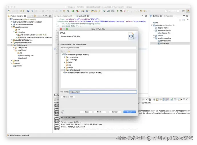 创建第一个页面。在WebContent目录创建一个HTML文件命名为index.xhtml, 点击Next.
