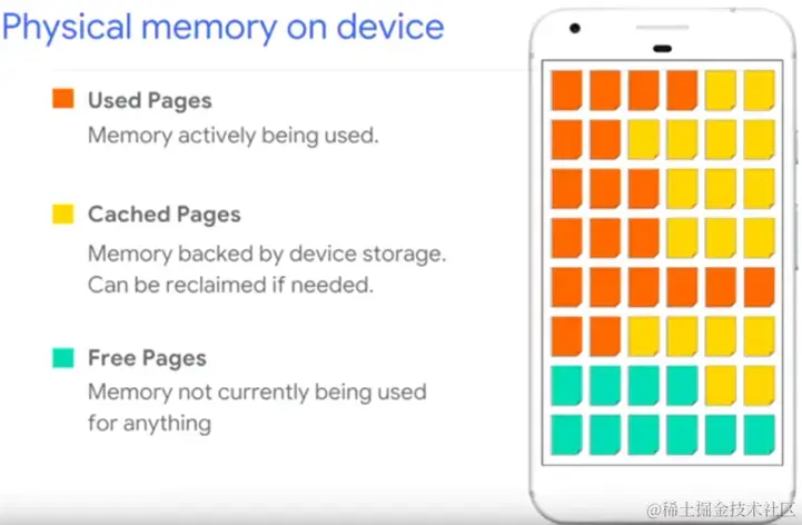 根据操作系统所学的知识:物理内存被分为很多页(Page),每页 4KB。通过对Page的读写来保证内存的正常使用。其中Pages如下图所示,分为使用的、未使用的、缓存的 在 Android的系统中,有专门用于回收 Cached pages 的 kswapd 进程:起作用为: