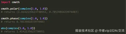 虽然cmath模块处理复数可以有很大的帮助。复数的模数可以使用内置函数abs()来计算,并且可以使用cmath模块中提供的函数phase(z)计算出其相位。可以使用polar(z)将复数从矩形形式转换为极坐标形式,这将返回一个元组(r, phi),其中r是abs(z),phi是phase(z)。