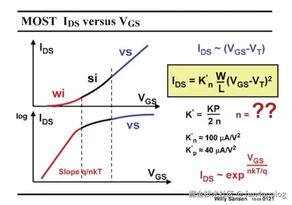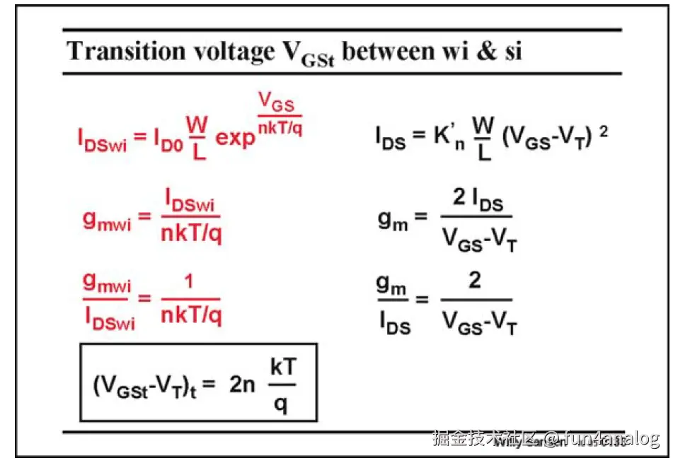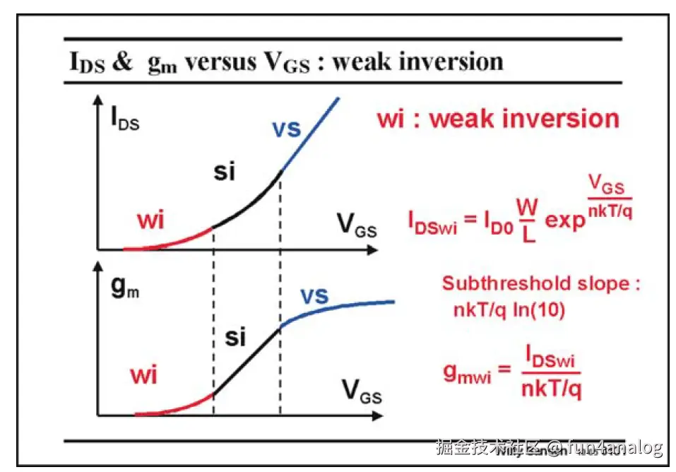 当Vgs接近Vth, 进入亚阈值区即弱反型(weak inversion). 电流Ids和Vgs成指数关系. 在相同Id下, 亚阈值区的gm较大.