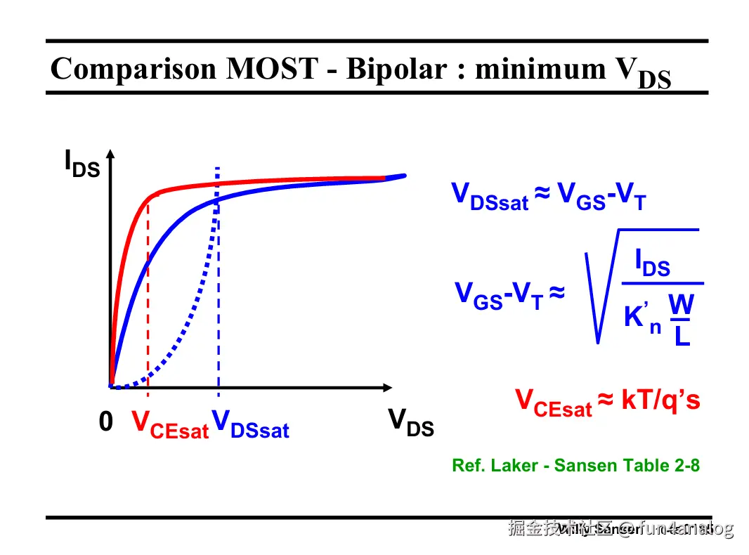 MOS要处于饱和区, 需要Vds>Vgs-Vth. BJT处于饱和区, 只需要Vce>Vce,sat=几倍kT/q=4*26mV, 大约为0.1V. 因此BJT适用于Low Power Supply场景.