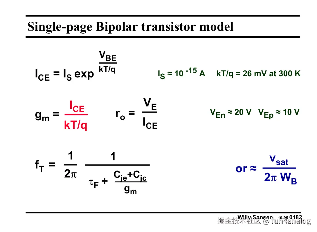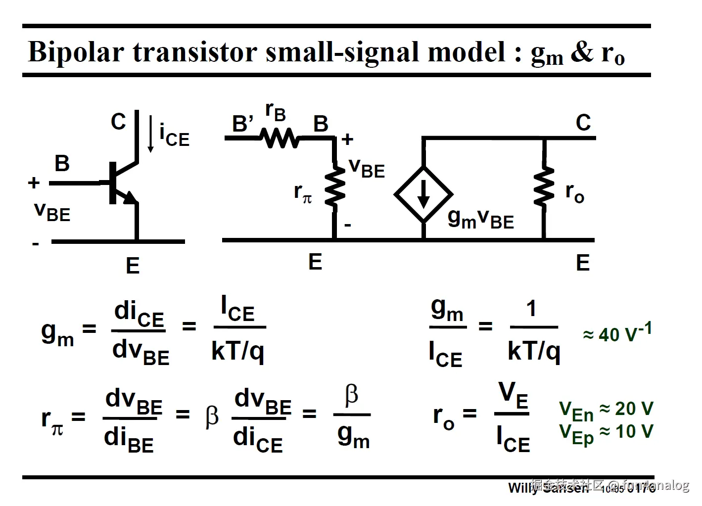 BJT的小信号模型 gm和ro公式. BJT的gm/Ice达到40/V, 远大于MOS