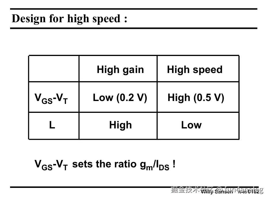 为了得到高增益, Vgs-Vth需要小, (0.2V), L需要大.