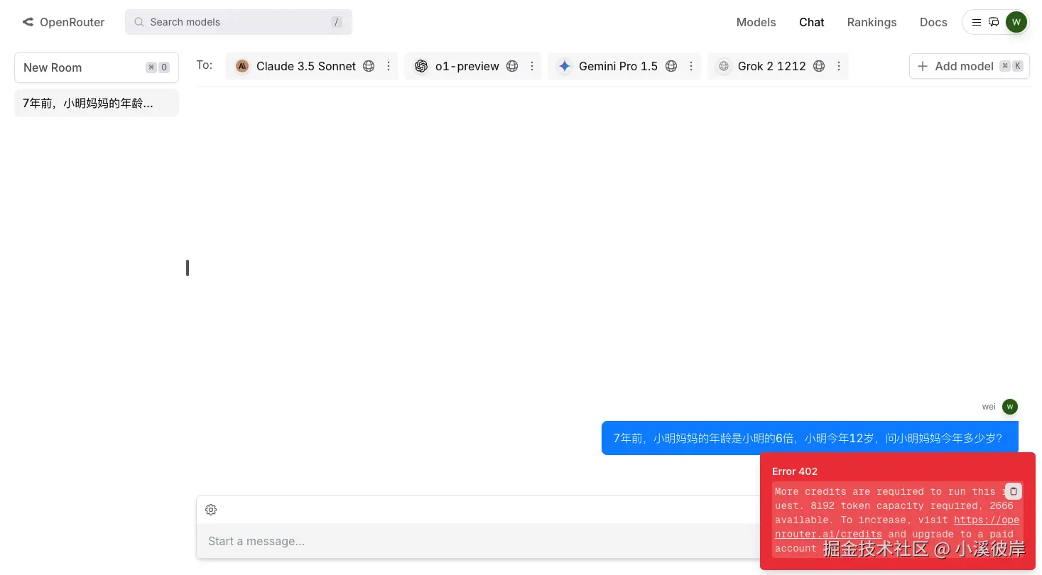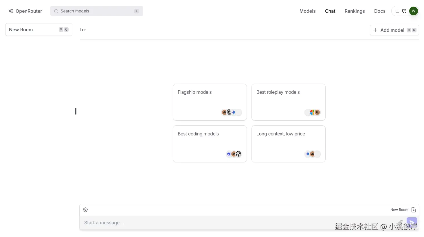 点击顶部的【Chat】进入到Chat页面,这是OpenRouter调用模型能力聊天的页面
