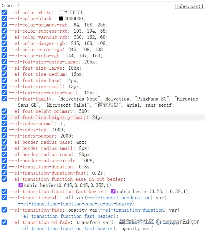 前面我们定义了那么多变量值,现在我们需要将这些变量值全部注册到根样式下,这样在其他组件使用 var(xxx)变量名是可以直接访问到对应变量的样式。我们需要将packages\theme-chalk\src\common\var.scss 下所有组件的公共变量全部声明在 root 下。