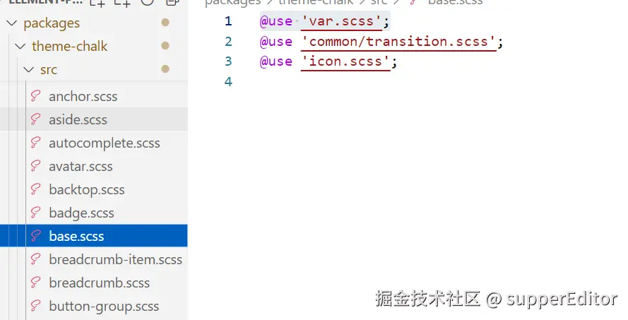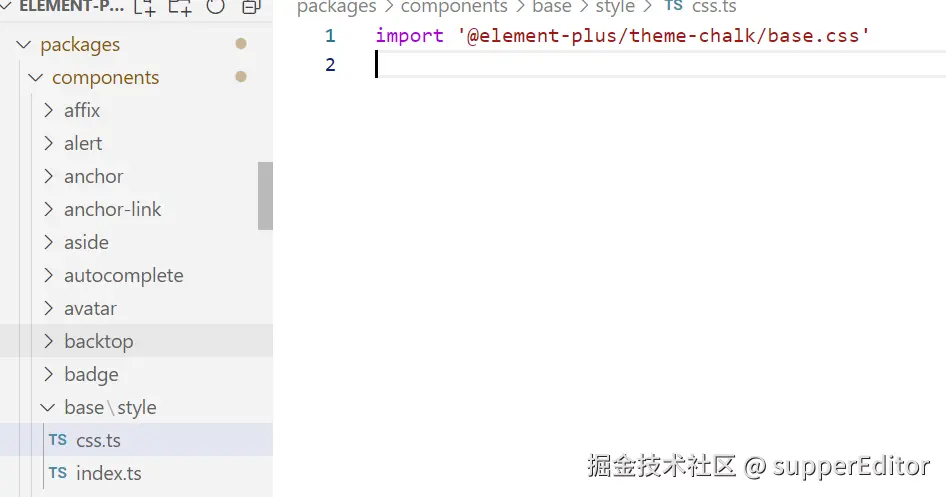 Element Plus 在 packages\components目录下创建一个 base目录来导入 packages\theme-chalk 目录下的公共样式( root )和一些基本公共样式,这个目录下packages\components\base\style\css.ts 的文件可以导入打包好的全局 css 样式,加快渲染速度。采用这种目录结果管理样式是为了分支管理,尽可能的降低各个项目之间的耦合度。而packages/components 目录下的组件可以引用 components/base 目录下的公共样式。