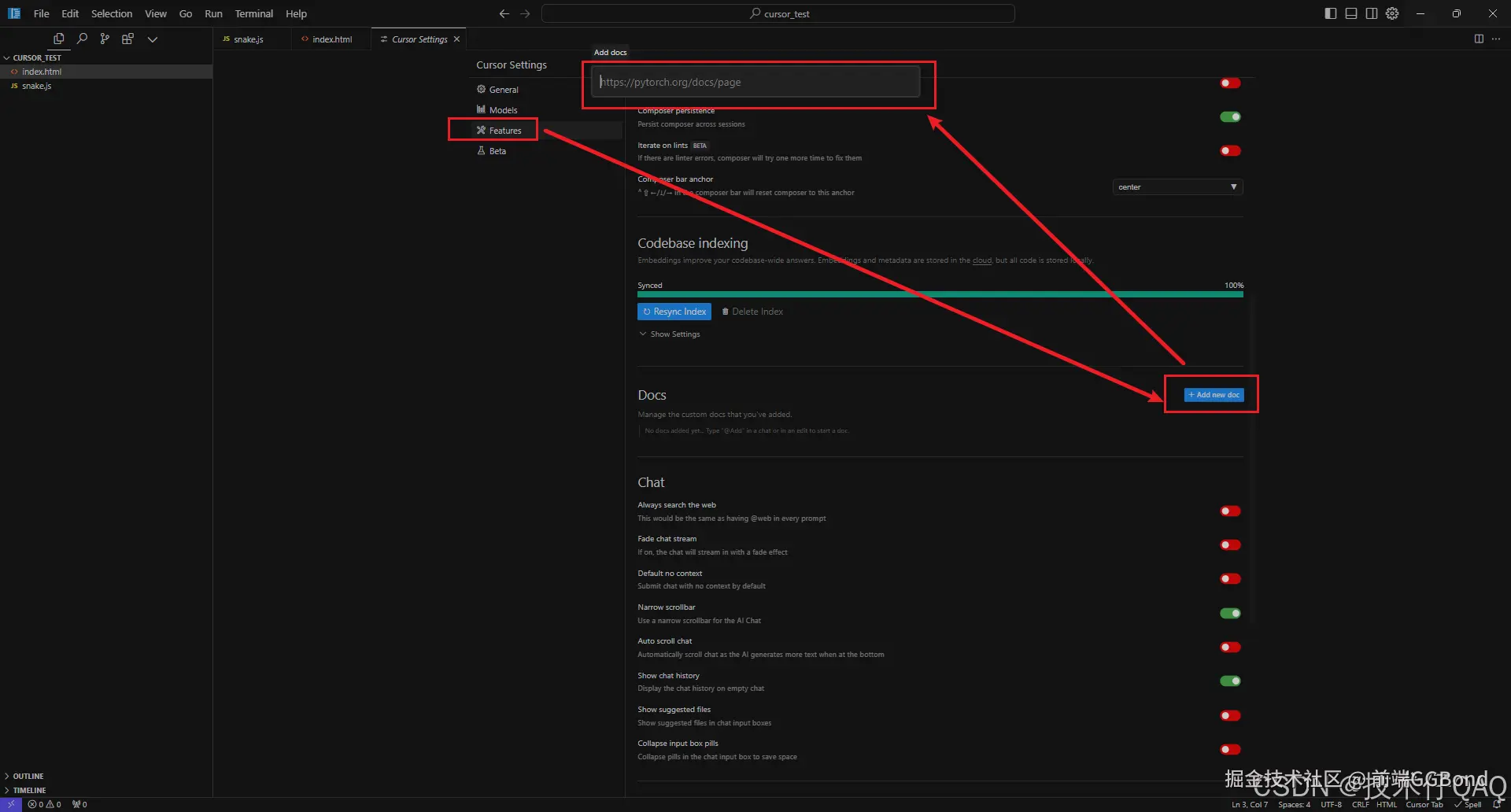 cursor也提供了为外部文档建立知识库进行问答的功能,可以在设置中加入文档,例如加入开发文档作为Cursor的知识库来更好的辅助编程。