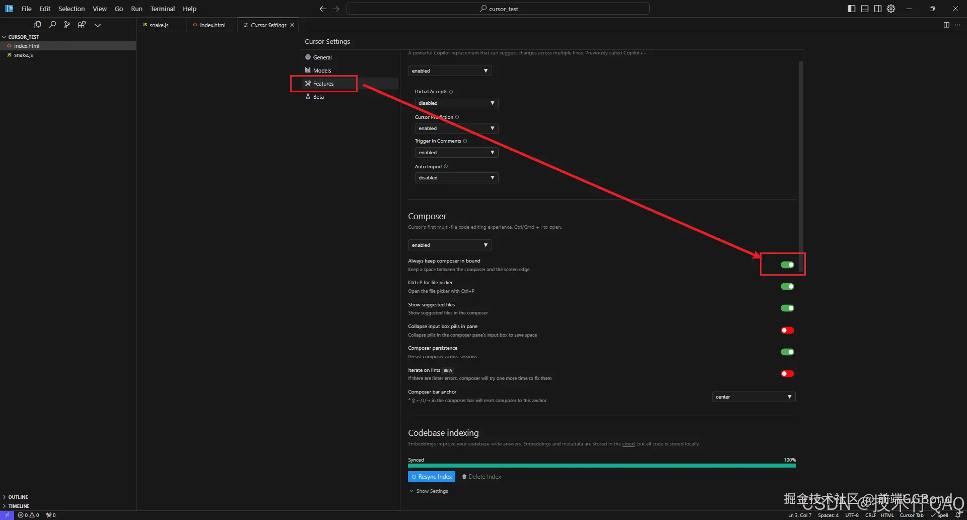 Ctrl+i由于过于强大,所以想单独在这里介绍,Ctrl+i是专为整个项目设计的,可以通过和模型对话来开发整个项目,过程就和聊天差不多,在会话中可以帮助你创建文件、删除文件、同时编辑多个文件等功能。使用Ctrl+i需要打开设置中的按钮: