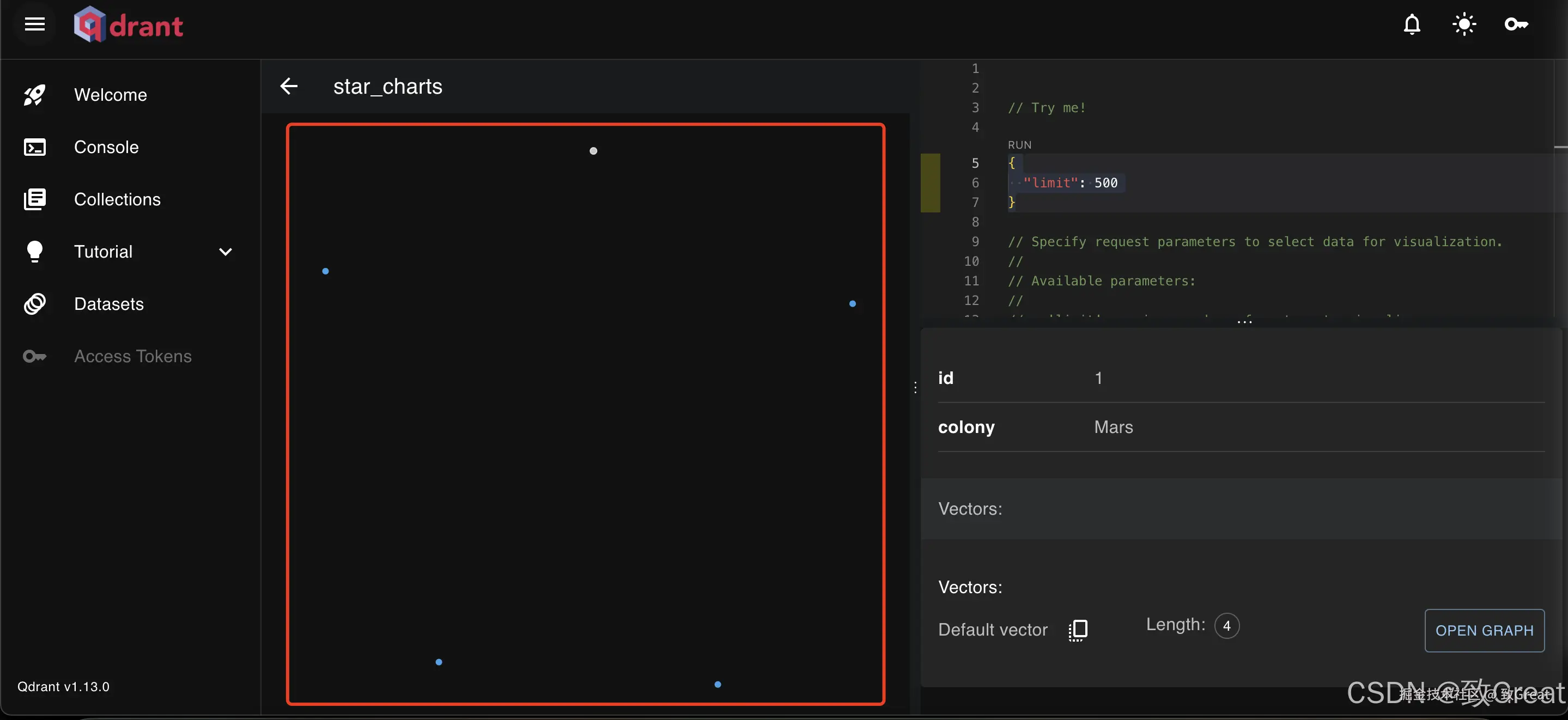 首先,我们需要创建一个名为 star_charts 的集合,用来存储殖民地数据。每个位置都会用一个四维向量来表示,并且我们会使用点积(Dot Product)作为相似度搜索的距离度量。
