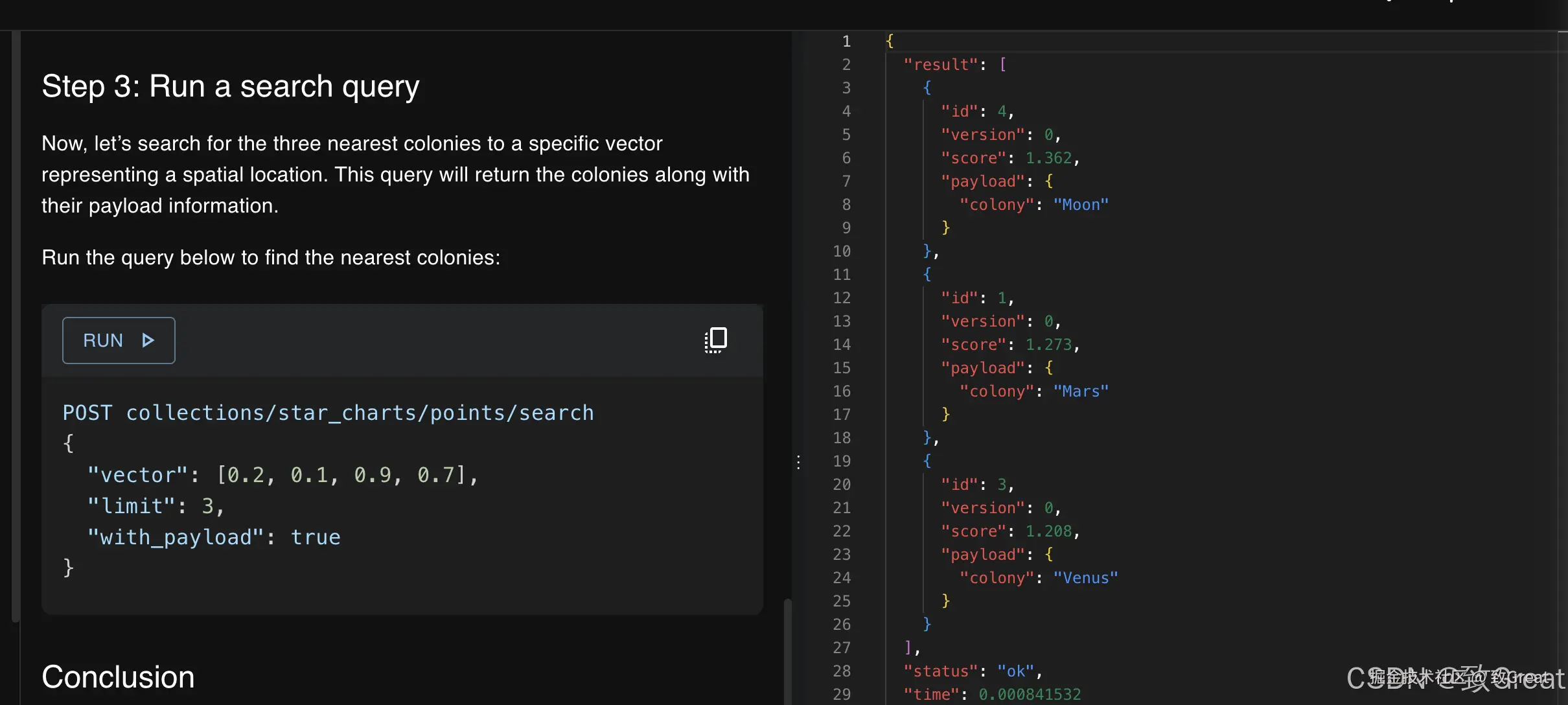 现在,我们来搜索一下与某个特定向量(代表一个空间位置)最接近的三个殖民地。这个查询会返回这些殖民地以及它们的 payload 信息。