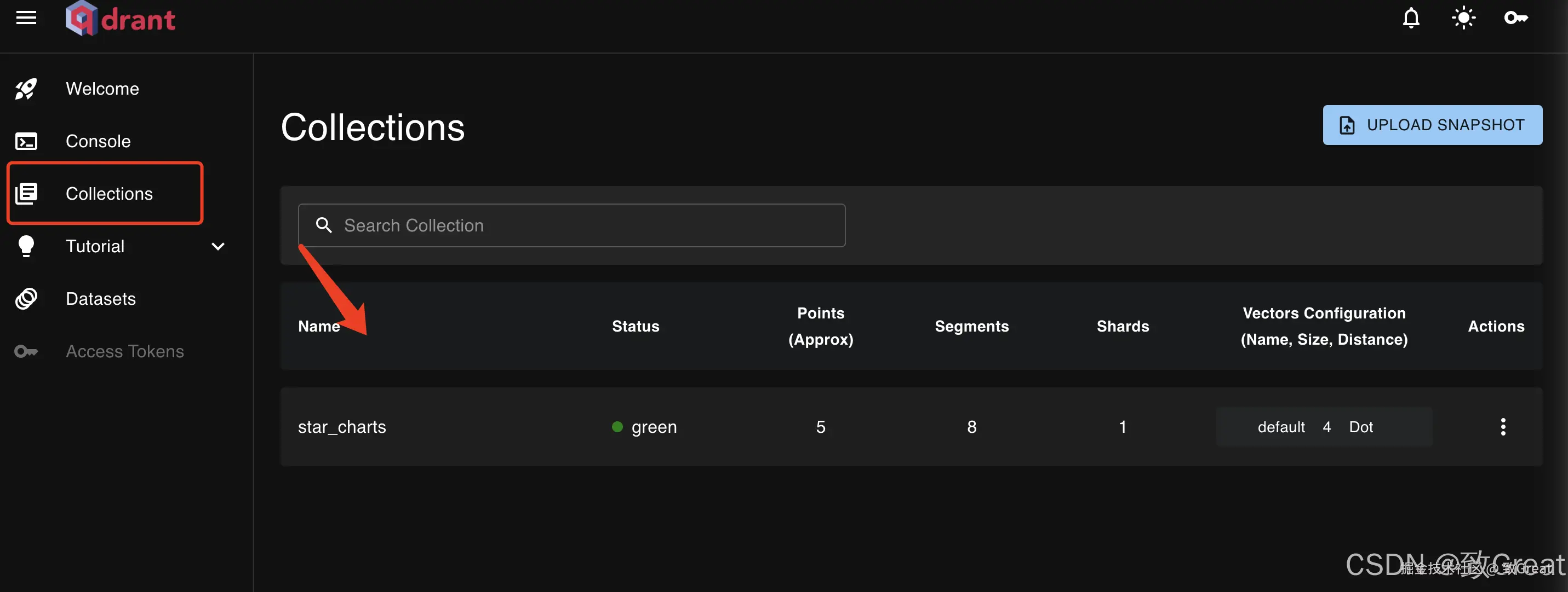 Qdrant向量数据库的集合概念可以类比MYSQL的表结构,用于统一存储同一类向量数据,集合中存储的每一条数据,在Qdrant中称为点(points),这里的点有数学几何空间的点类似的意思,代表向量在几何空间中的表示(你就当成一条数据看待就行)。