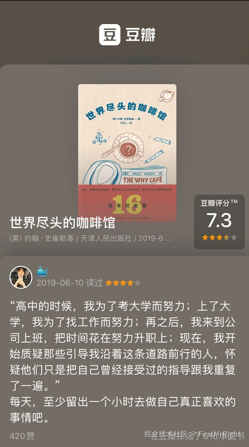 十一月份我做了一个统计,2024年在掘金平台共更新文章20篇,在2024年进行到四分之三的时候,我完成了目标值的四分之一。原因同上,2024年技术方面学习时间减少,知识分享产出会对应的减少,我也没有为了完成所谓的KPI而水文。今年看了好多本书,脑子里不断涌现出一句话:“做事情要以个人意志为导向,做自己想做的事就是在实现自己人生意义的路上”。我确信这句话并非摘抄于书本,但来源于书本与生活,同时分享一下《世界尽头的咖啡馆》这本书在豆瓣APP中的一个热评: