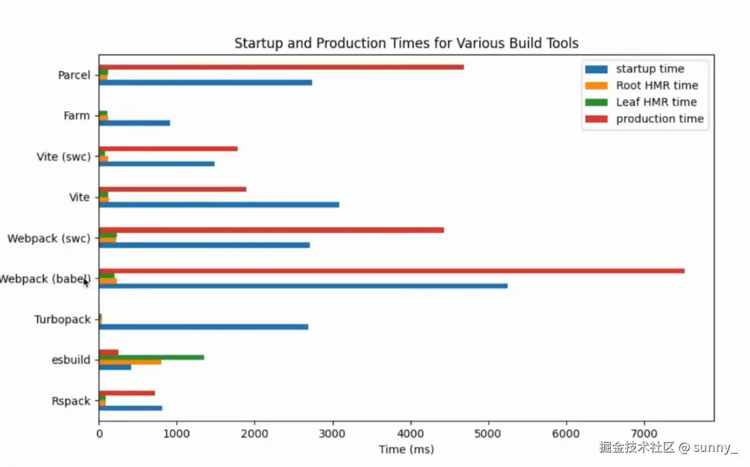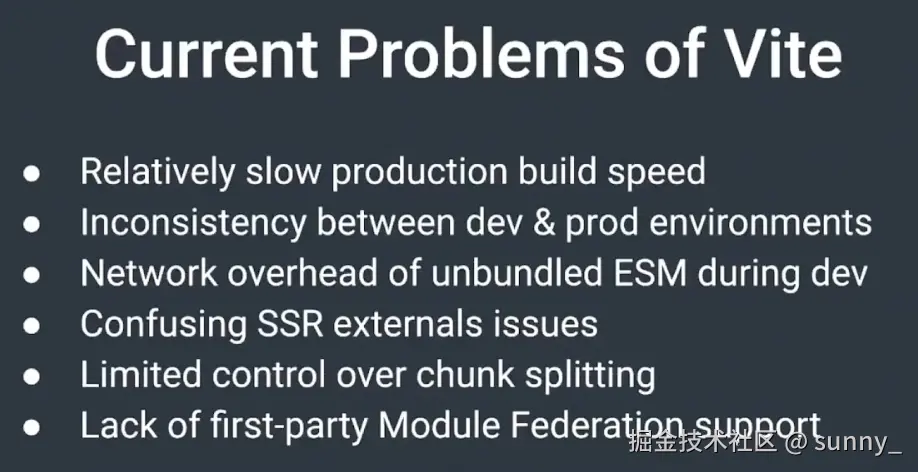 - 然而,这些解决方案的切入点比较单一,并没有解决根本问题。比如 swc-loader 只能在 loader 层做优化,但是 webpack 有其他性能瓶颈;vite 生产环境构建性能差,拆包能力;esbuild 不支持 hmr,打包能力,插件能力弱很多