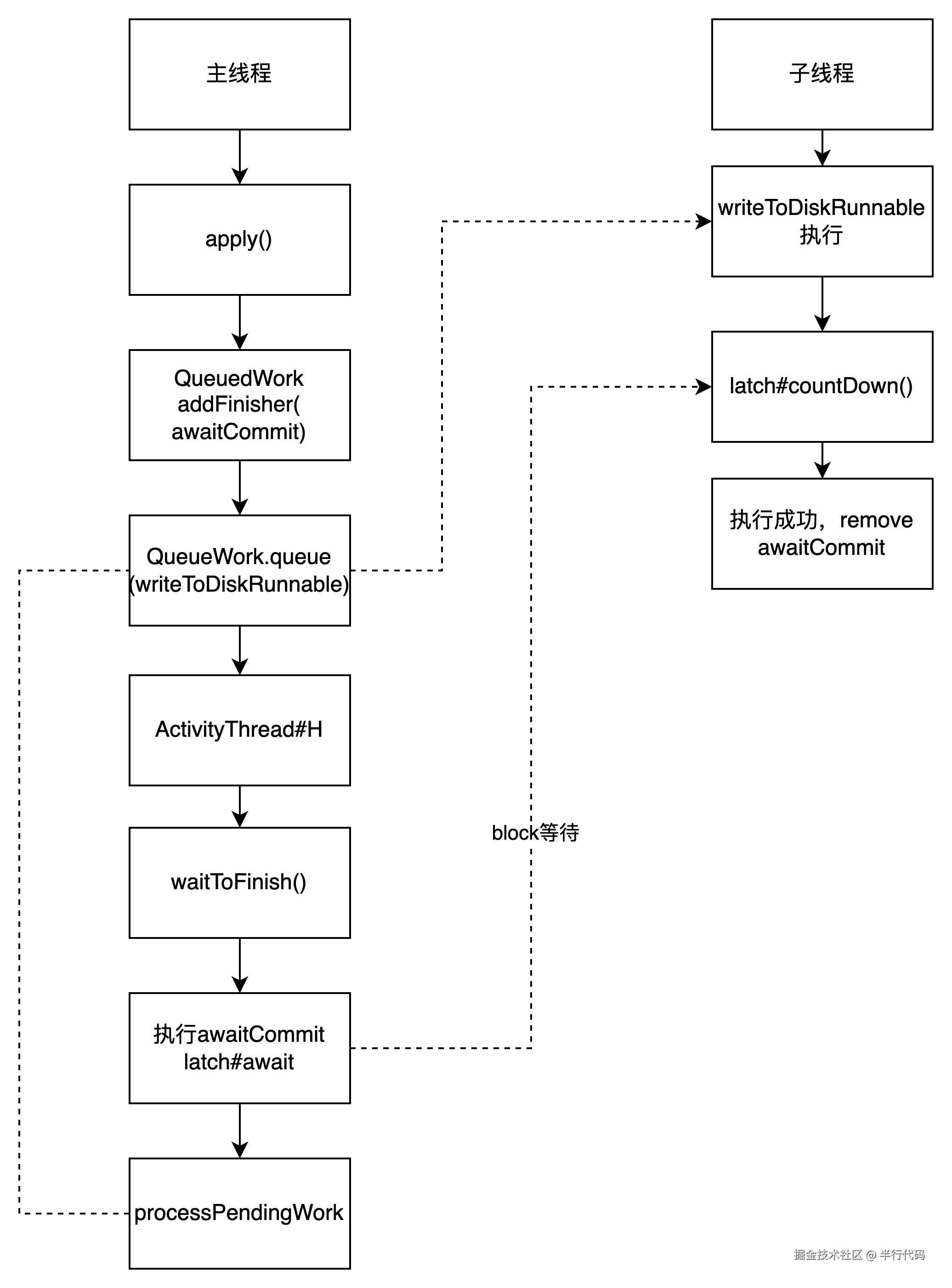 SharedPreference apply不是运行在子线程吗,为什么还会导致主线程卡顿?我们从apply的流程看起: