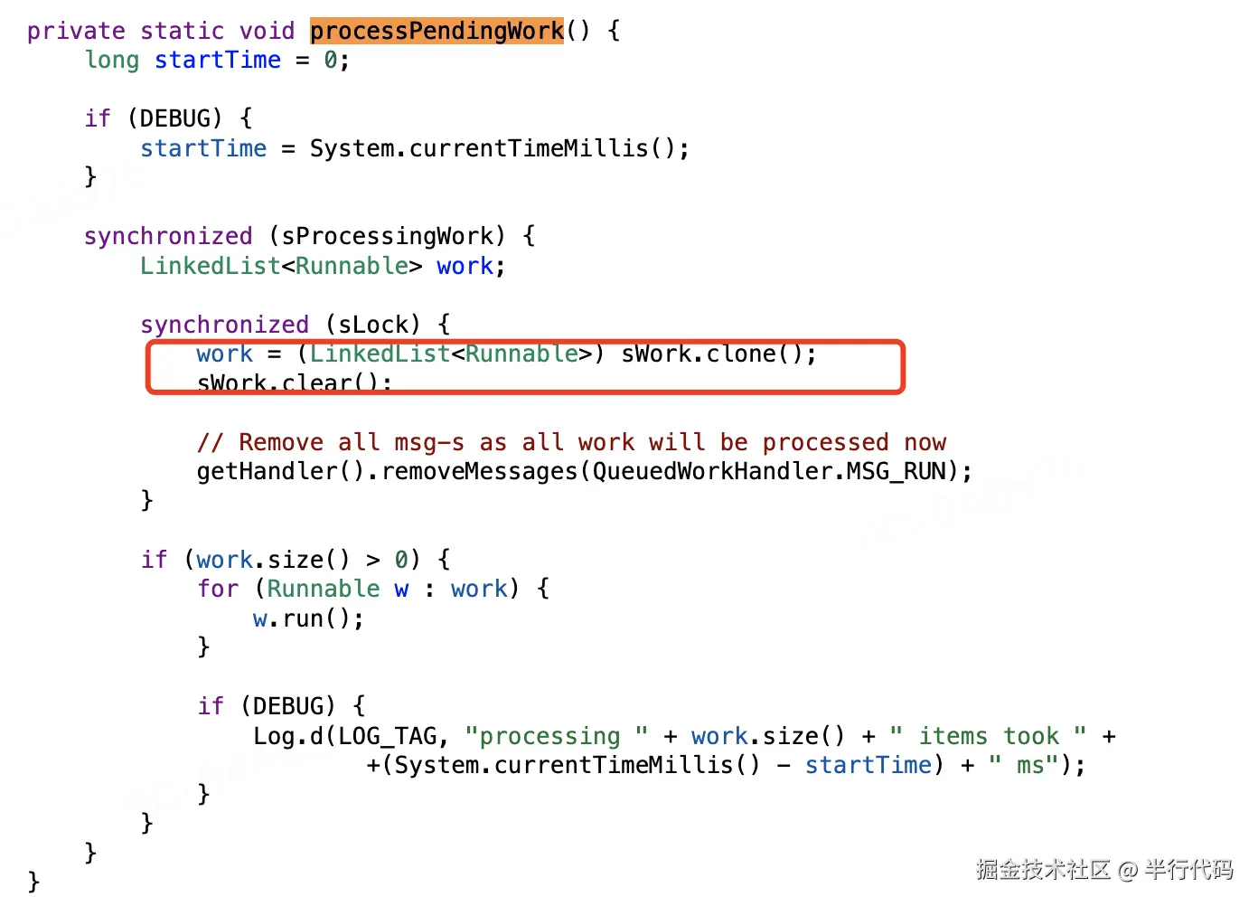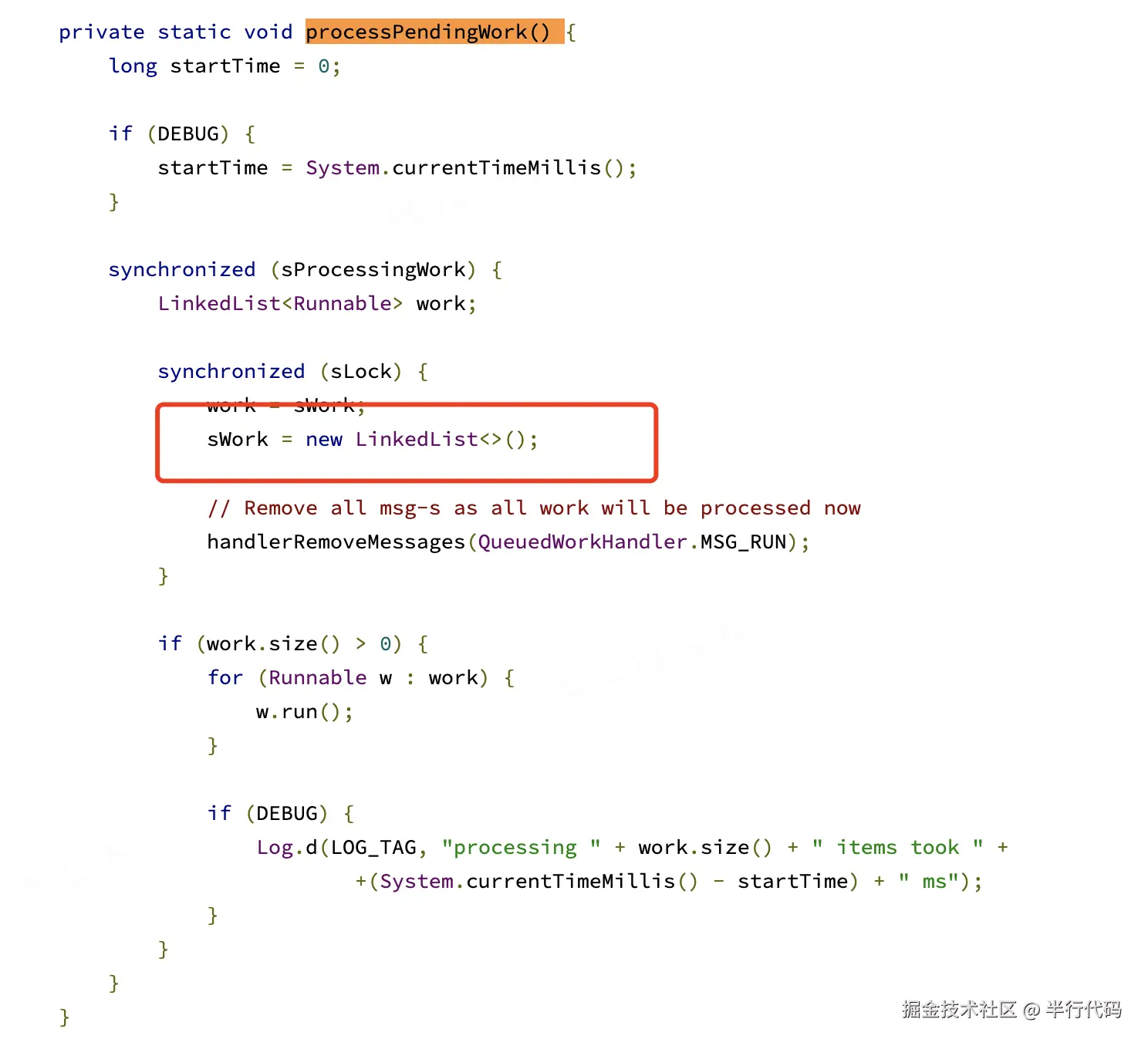 - 主线程会调用processPendingWork,遍历执行sWork里的Runnable(修改sWork字段,让每次执行的时候在子线程启动)