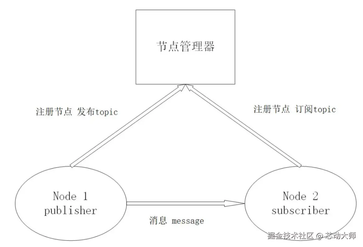 ROS中的通信方式中,topic是常用的一种。对于实时性、周期性的消息,使用topic来传输是最佳的选择。topic是一种点对点的单向通信方式,这里的“点”指的是node,也就是说node之间可以通过topic方式来传递信息。topic要经历下面几步的初始化过程:首先,publisher节点和subscriber节点都要到节点管理器进行注册,然后publisher会发布topic,subscriber在master的指挥下会订阅该topic,从而建立起sub-pub之间的通信。注意整个过程是单向的。其结构示意图如下: