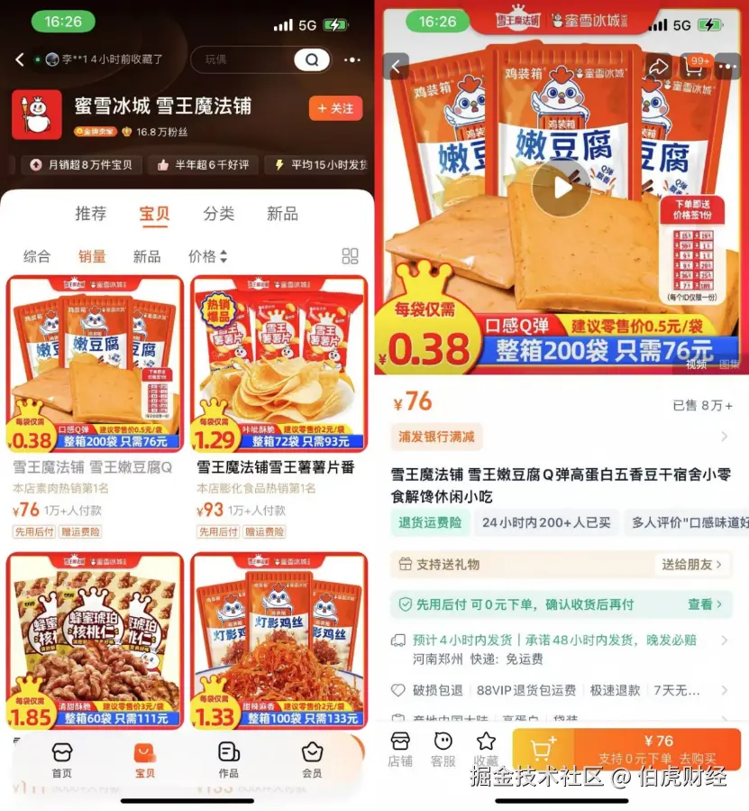 此外,雪王还在淘宝开设了“雪王魔法铺”,销售茶系列、口袋零食系列、咖啡系列、杯子系列、文创周边系列等系列产品,目前该店销量最高的嫩豆腐干,已售出8万+份。
