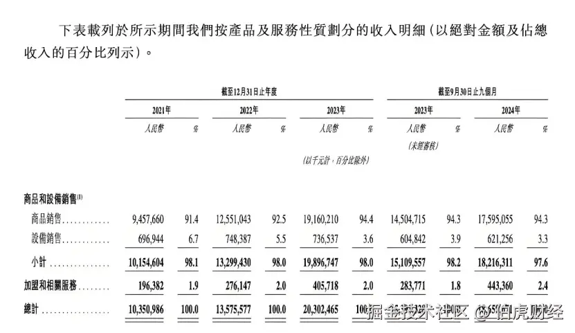 2024年前9个月,蜜雪冰城的加盟和相关服务收入为4.4亿元,仅占总营收的2.4%;向加盟商销售设备的收入约为6.2亿元,占总收入的3.3%,约95%的公司收入,其实是来自向加盟商销售物料(包含糖、奶、茶、咖、果、小料等材料),收入约为176亿元。