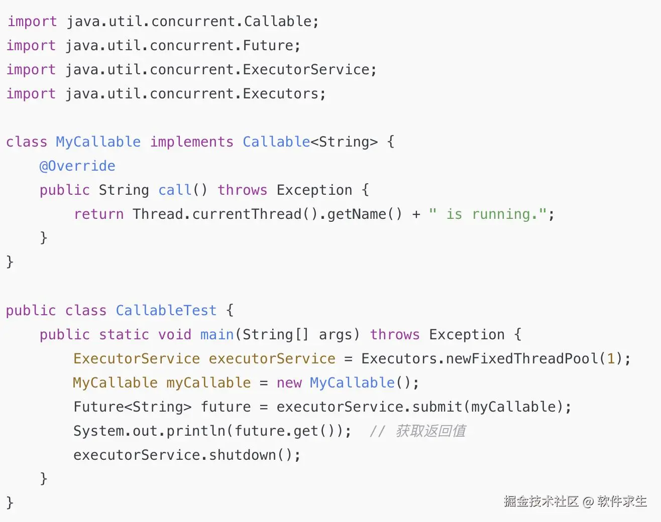 - 实现 Callable 接口:适合需要返回值或者可能会抛出异常的任务,通常与 ExecutorService 配合使用。