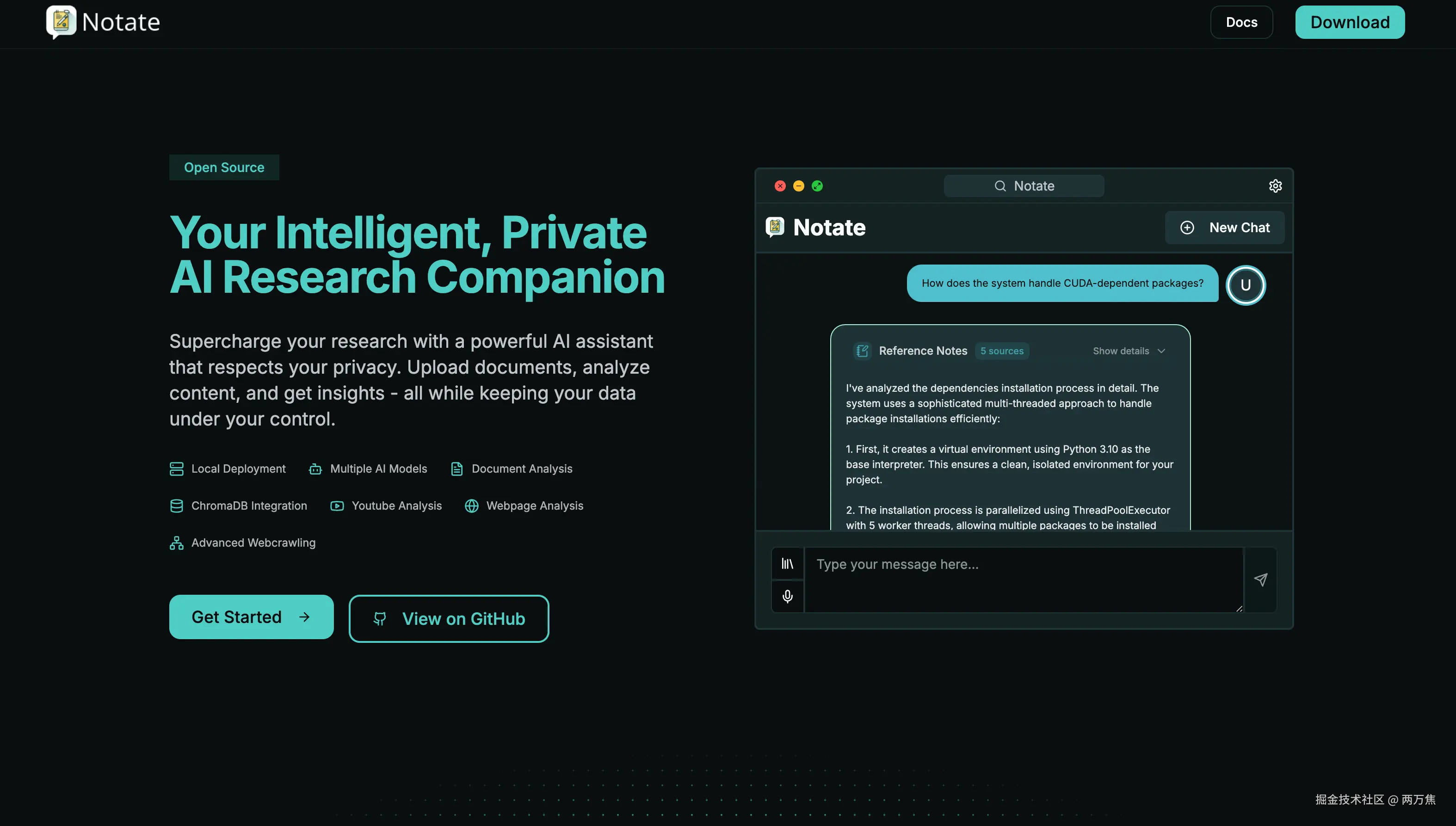 - Notate:可以私有部署的 AI 研究助手,提供文档分析、网页和 YouTube 内容分析