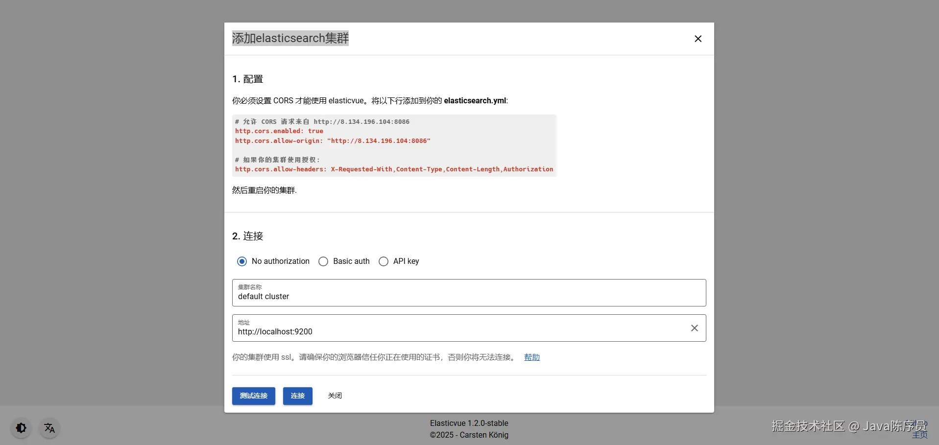 4、添加 ElasticSearch 集群前需设置 CORS, 将面板里面的配置添加到 elasticsearch.yml, 并重启集群