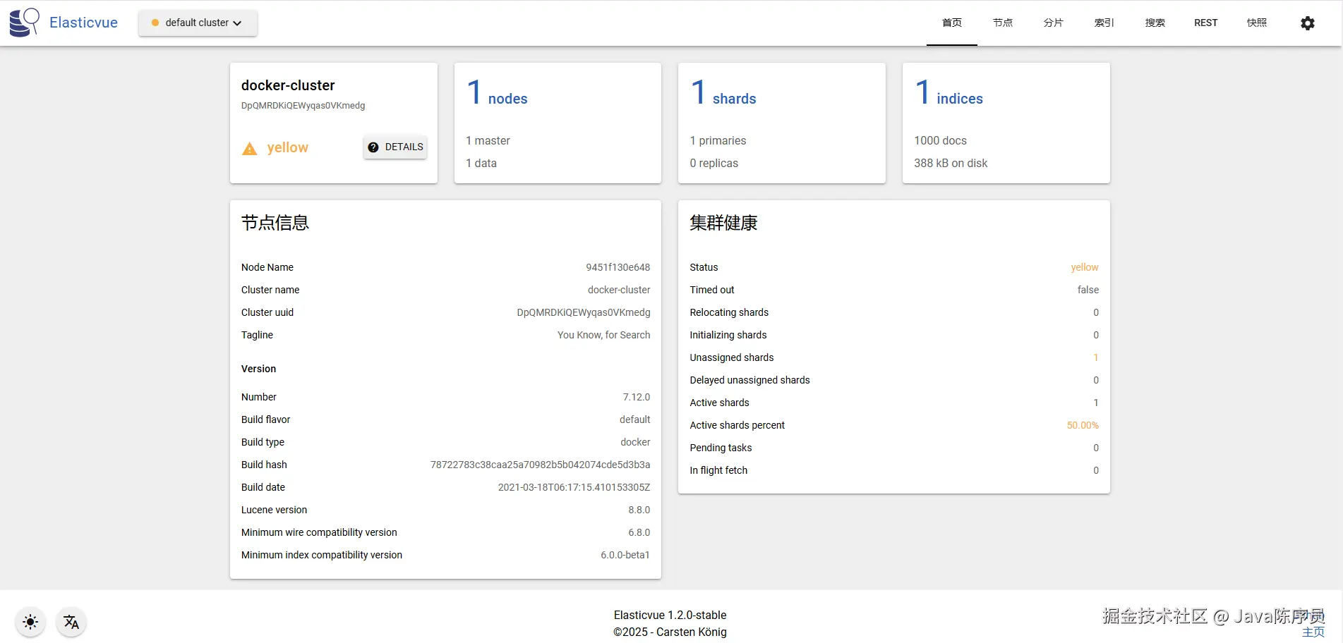 5、连接成功后在首页就可以看到 ES 的状态信息了,比如版本号、集群状态等