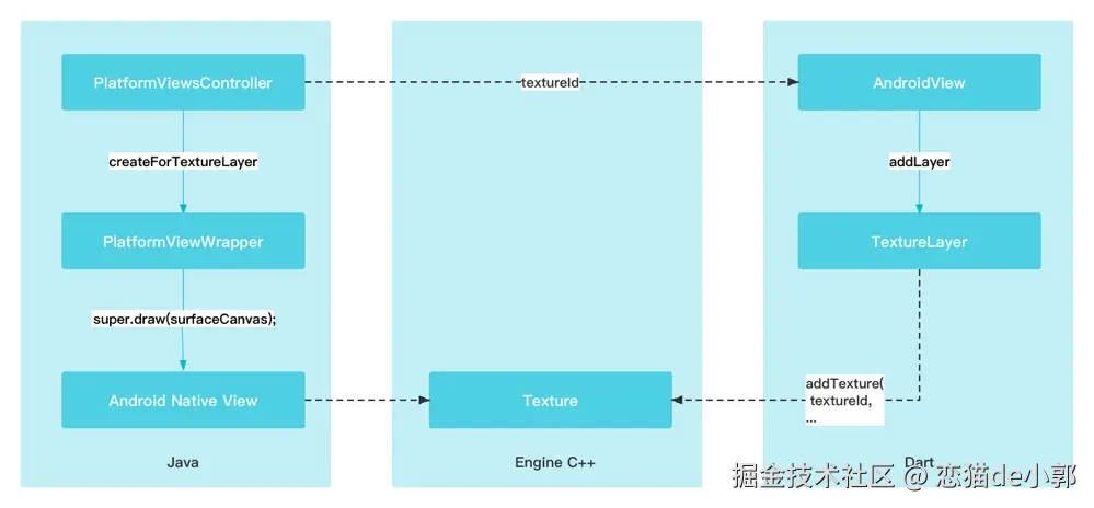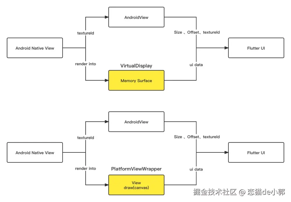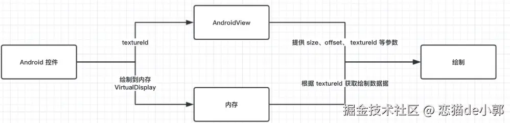 AndroidView需要渲染的内容绘制到VirtualDisplays,然后在VirtualDisplay对应的内存中,绘制的画面就可以通过其Surface获取得到;现在AndroidView需要的内容,会通过 View 的draw方法被绘制到SurfaceTexture里,然后同样通过TextureId获取绘制在内存的纹理 ;