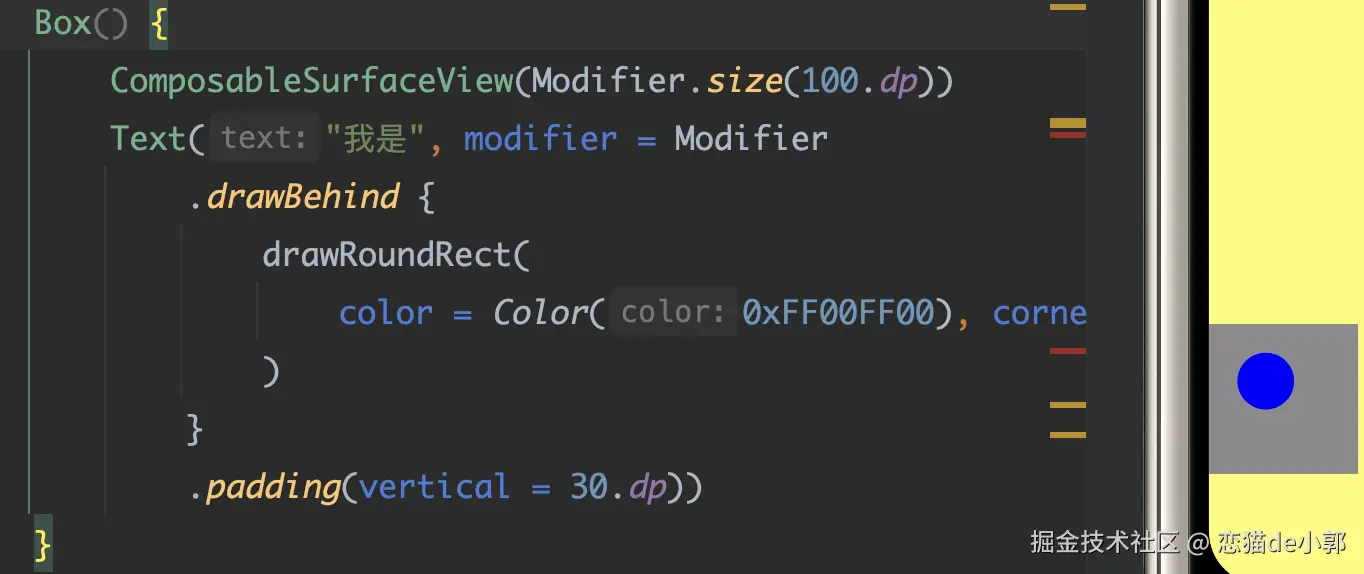 可以看到,上面代码的 SurfaceView 灰色的背景和黄色的圆都被渲染出来,另外 Text 的 Compose 文本也正常带着背景色覆盖显示在 SurfaceView 上: