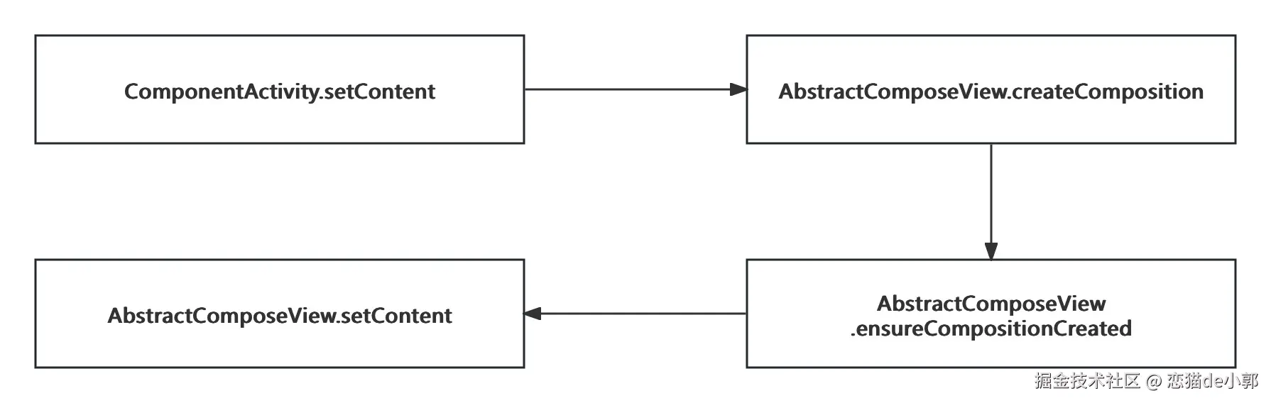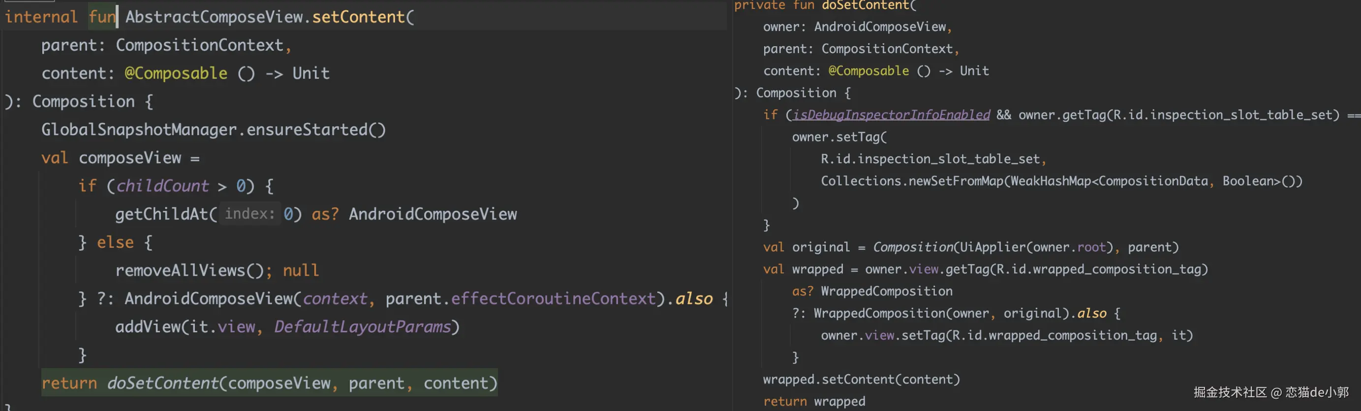 我们从 Activity 开始往下找,经过几个简单调整,就可以在 AbstractComposeView.setContent 找到创建 AndroidComposeView 的地方: