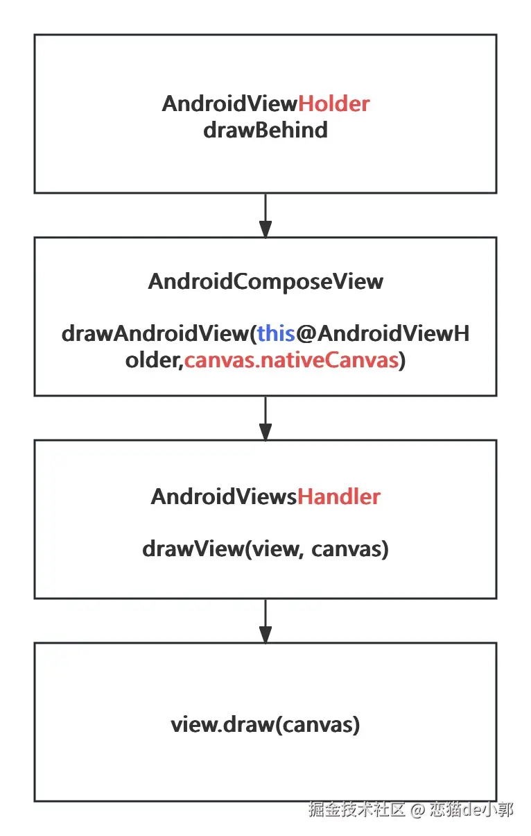 流程上如下图所示,这里的核心其实就是:将 Compose 里 drawBehind 的 Canvas 传递给「传统 XML View」,这样在绘制时用的就是来自 Compose 体系 drawBehind 的 Canvas 链条: