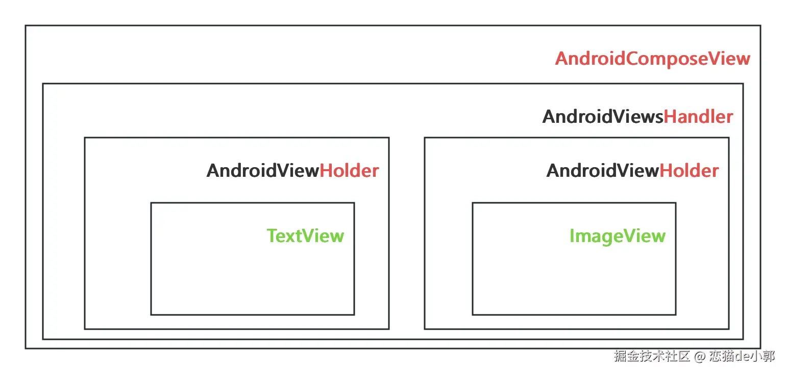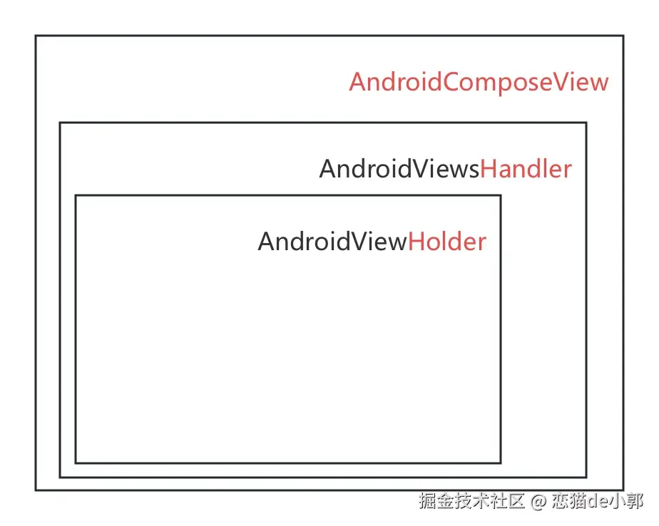AndroidComposeView,它是一个 root LayoutNode AndroidComposeView内部的AndroidViewsHandler会通过一个 hashMap 去触发和管理 children Holder 的布局和重绘AndroidViewHolder是一个代理 LayoutNode ,同时它将 Compose UI 的生命周期和测绘布局状态同步到传统 ViewGroup 控件