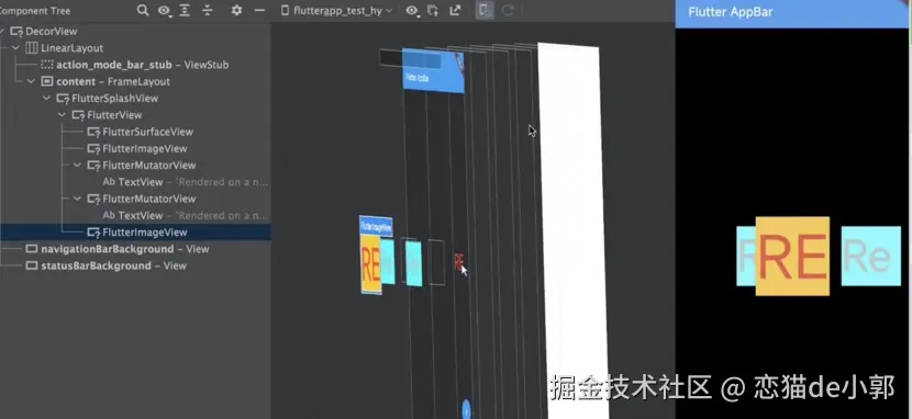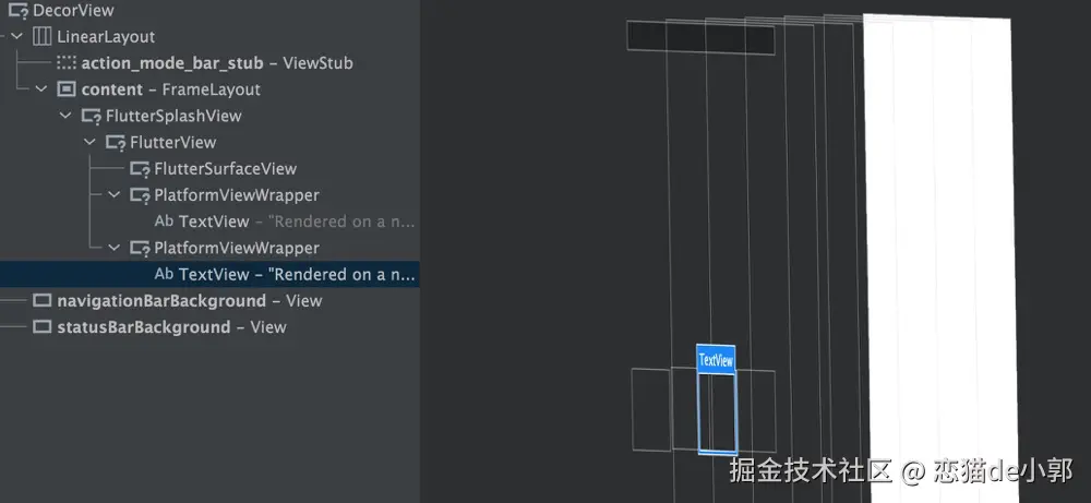 而如下图所示,其中蓝色的文本是原生的 TextView ,红色的文本是 Flutter 的 Text 控件,在中间 Layout Inspector 的 3D 图层下可以清晰看到: