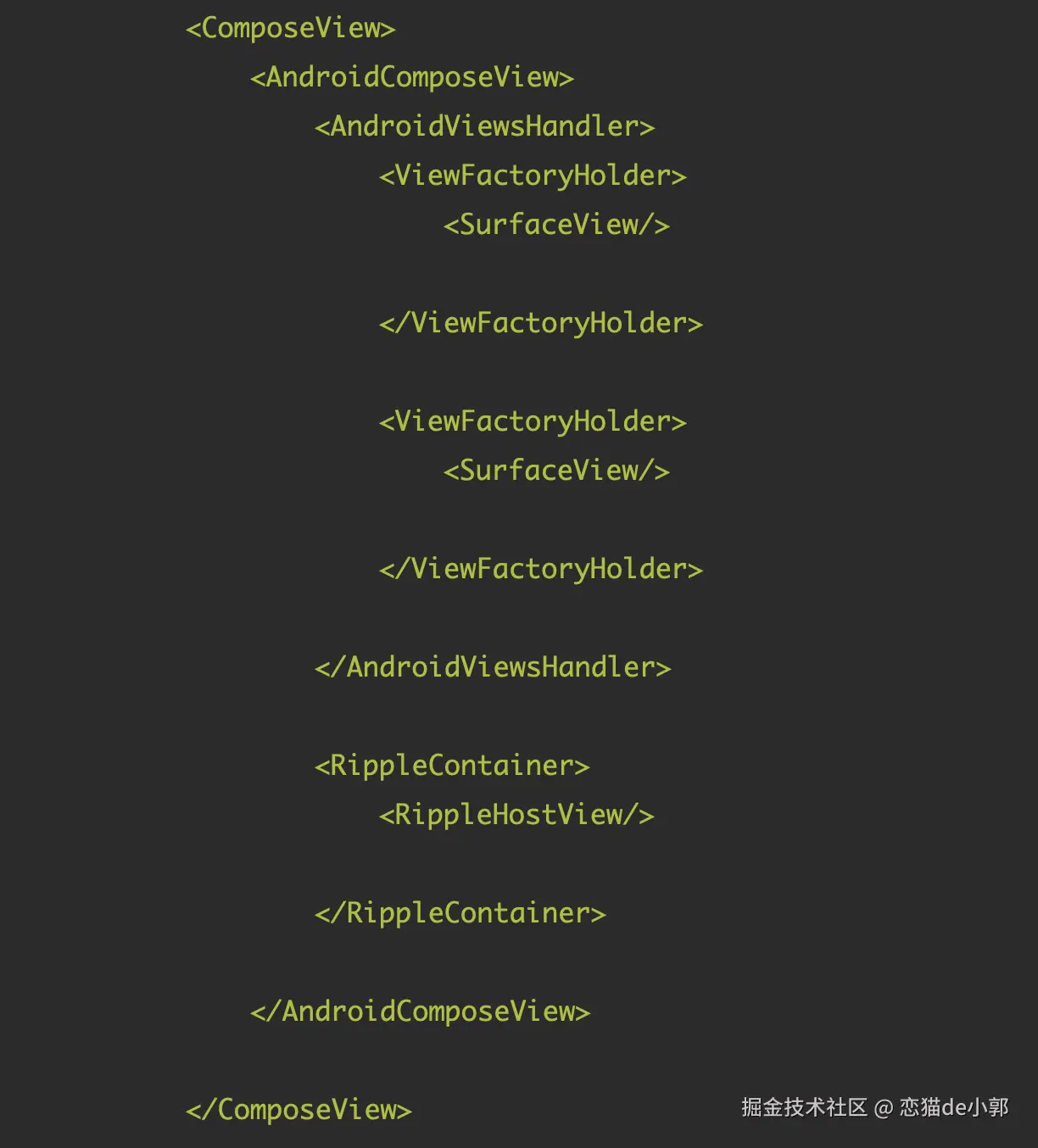 比如我们接入了两个 SurfaceView 到 Compose ,如果我们打印传统布局结构,大概可以看到这样的一个结果,: